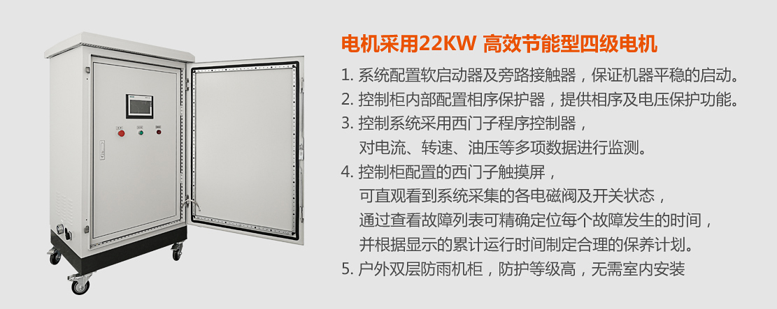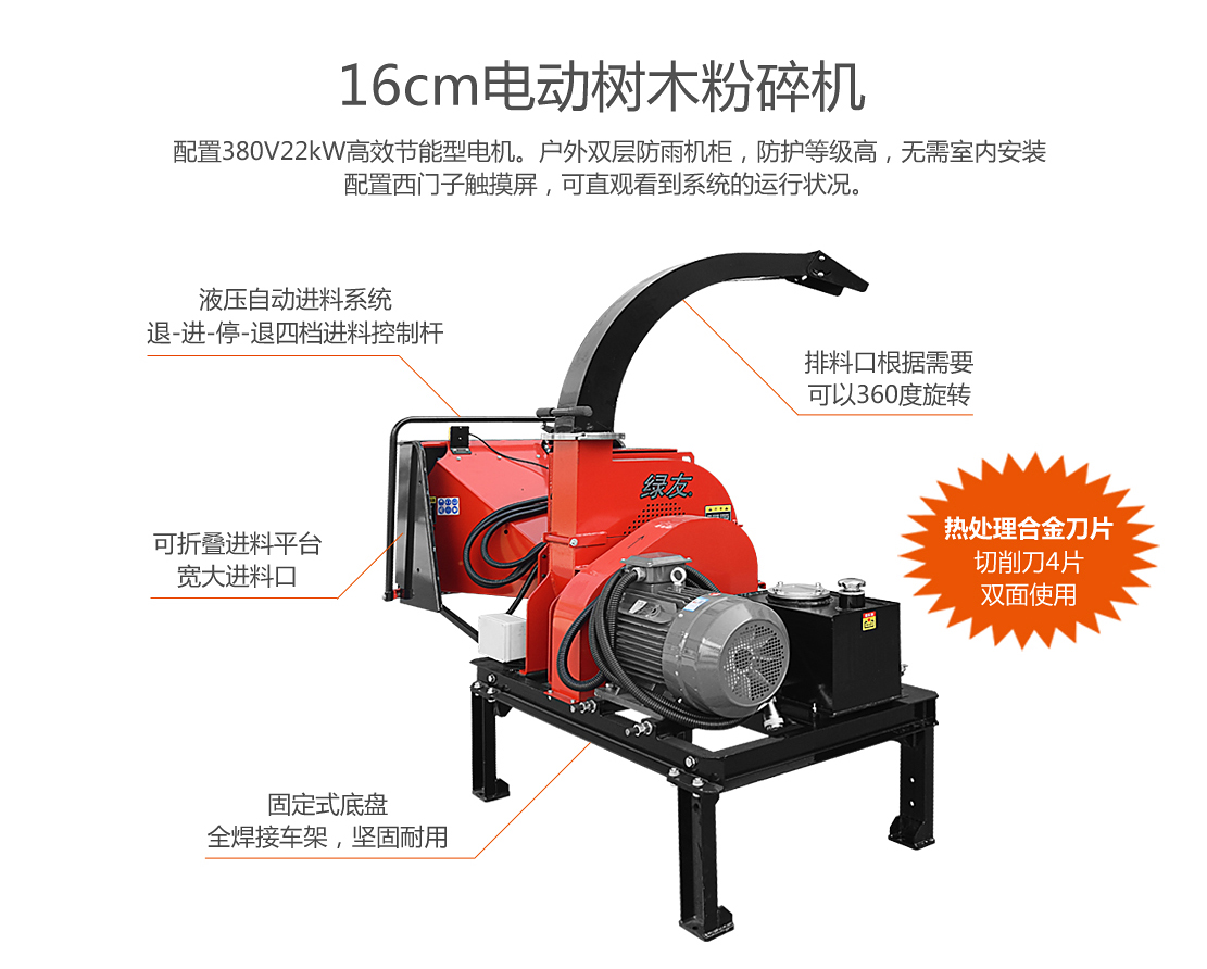 16cm電動粉碎機,配置380V22kW高效節能型電機。戶外雙層防雨機柜,防護等級高,無需室內安裝;配置西門子觸摸屏,可直觀看到系統的運行狀況。