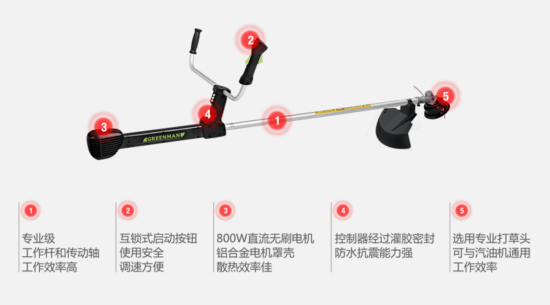 GREENMAN 電動割灌割草機從國內綠化管理的實際情況出發,選用800W大功率直流無刷電機和大直徑打草繩。在實現電動化的同時,又能滿足綠化養護的高效率。